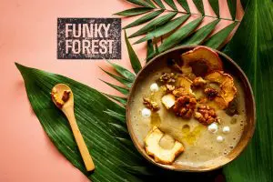 - Helyezzük az alap összes hozzávalóját a turmixgépbe, és 10-20 másodperc alatt aprítsuk csomómentes, lágyan krémes állagúra! Ha folyósabban szeretjük, adagoljunk még hozzá Funky Forest Horny Hedgehoge préslevet ízlésünk szerint!