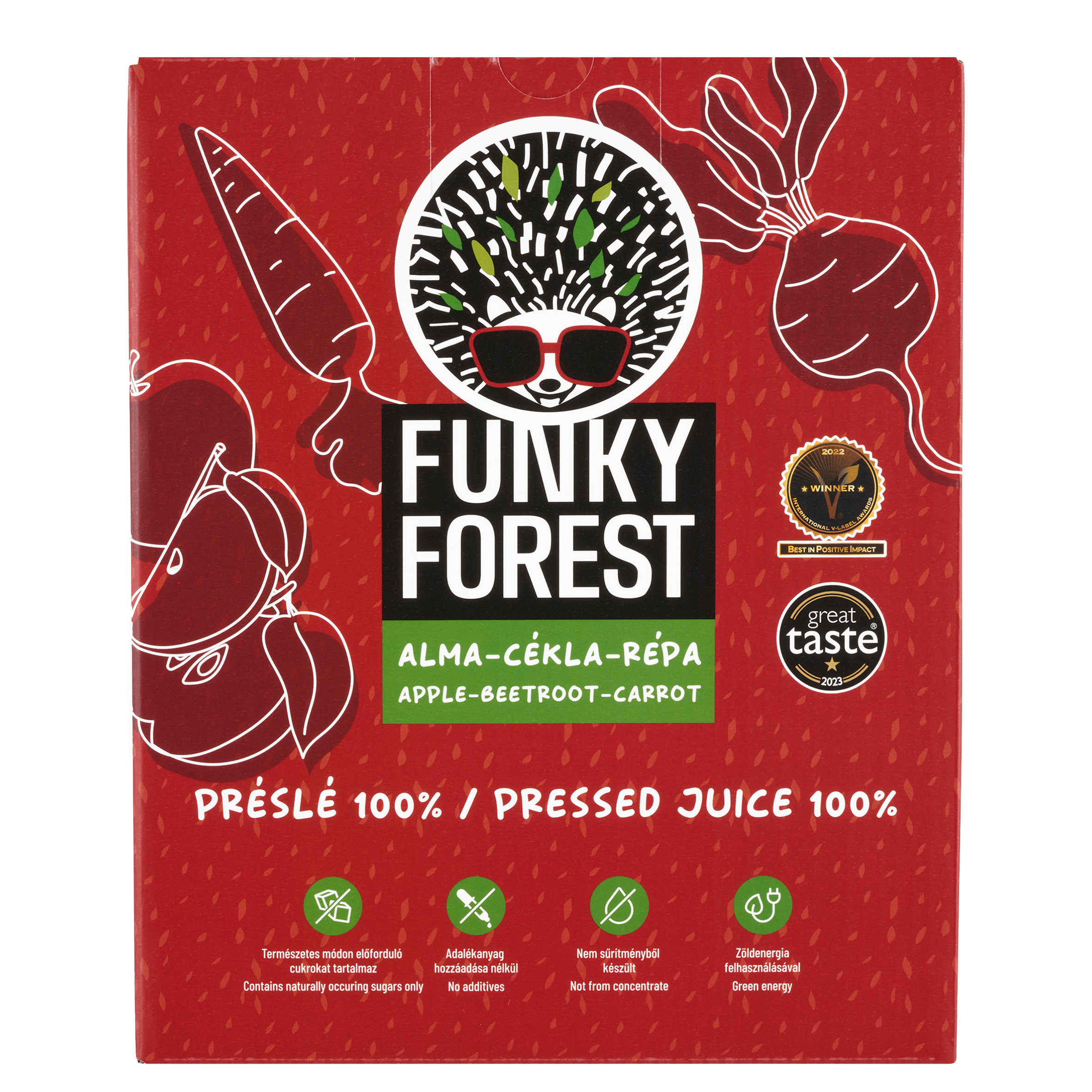 Mint minden Funky Forest termék, ez a préslevünk is 100% gyümölcstartalommal bír, nincsen benne tartósítószer, csak természetes módon előforduló cukrokat tartalmaz és zöldenergia felhasználásával, környezetkímélő módon készült. Vegán termék.
