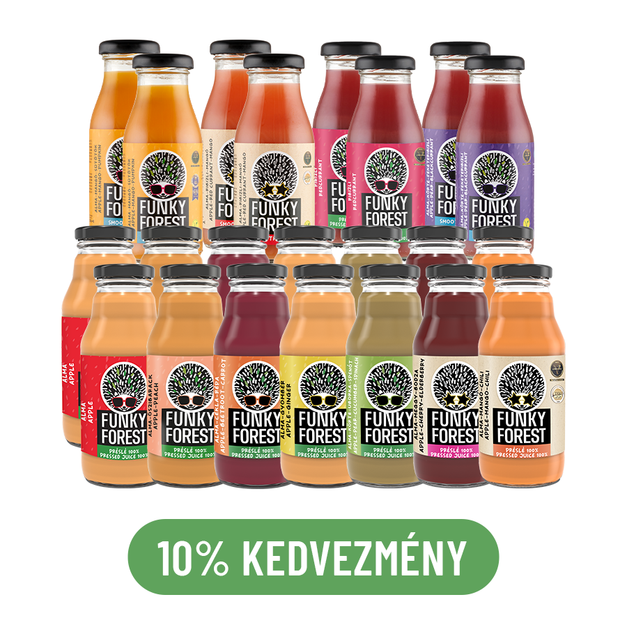 A csomag összesen 14 darab 330 ml (2 100% alma, 2 alma-őszibarack, 2 alma-cékla-répa, 2 alma-gyömbér, 2 alma-körte-uborka-spenót, 2 alma-meggy-bodza, 2 alma-mangó-chili) és 8 darab 200 ml (2 alma-mangó-sütőtök, 2 alma-ribizli-,mangó, 2 100% ribizli, 2 alma-körte-feketeribizli) terméket tartalmaz.