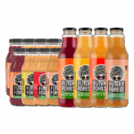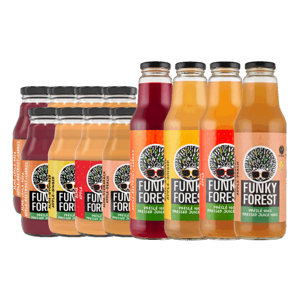 A csomag 8 darab 330 ml (2 alma-cékla-répa, 2 alma-gyömbér, 2 100% alma, 2 alma-őszibarack ) és 4 db 750 ml (alma-cékla-répa, alma-gyömbér, 100% alma, alma-őszibarack) terméket tartalmaz. A csomagban 1 db 330 ml préslevet ajándékba adunk.