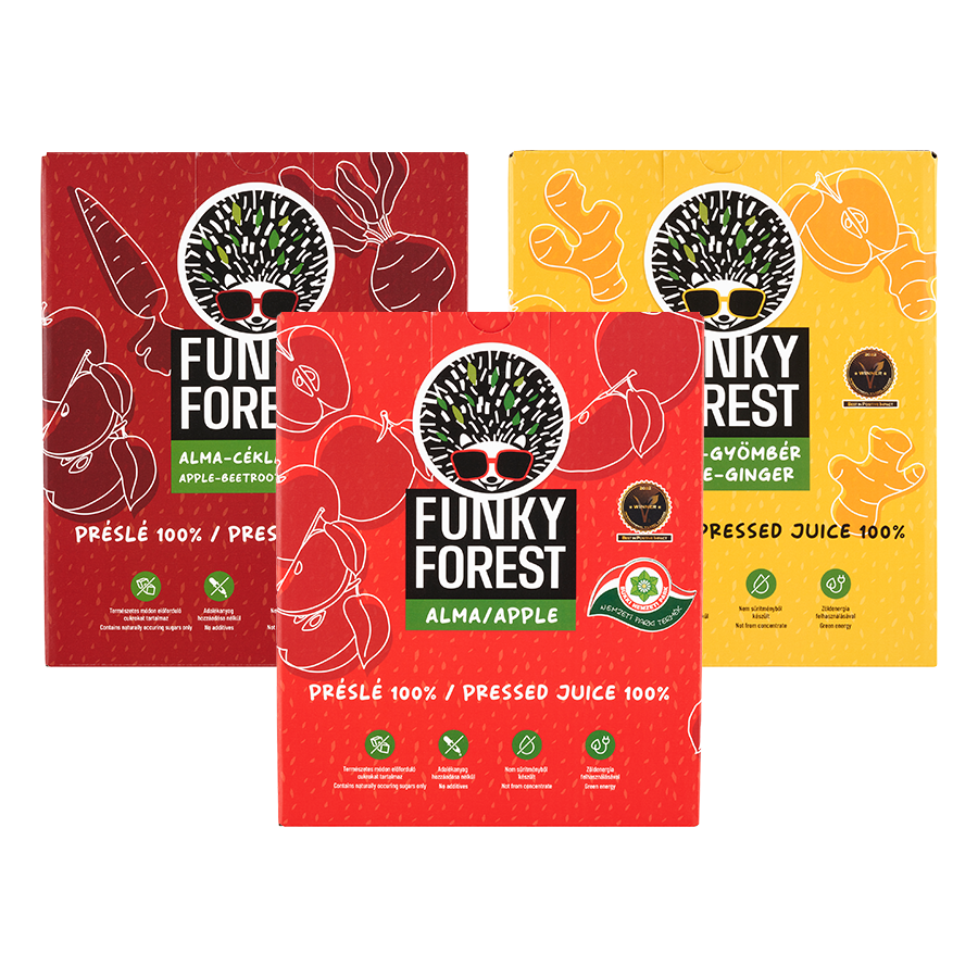 A csomag összesen 3 darab 3 liter Bag In Box (1 100% alma, 1 alma-gyömbér, 1 alma-cékla-répa) terméket tartalmaz. A csomag árának 5%-át a Sünbarát Alapítványnak ajánljuk fel.